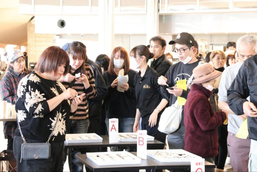 その間に会場にはA〜Jまでのアルファベットが割り振られた棚田米が並べられていきます。一般参加者のみなさんは、その中から最も美味しいと思った1種類に投票ができます。